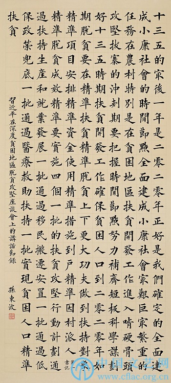 在决战脱贫攻坚收官之年,由中国文联、中国书协联合主办的“中国力量——全国扶贫书法大展” (以下简称“中国力量展”)11月上旬在北京中华世纪坛举行。展览以书法艺术的表现形式,全景深描中国共产党人探索与实践解决贫困这一世界性难题的集体智慧与全面建成小康社会的历史进程,在诠释演绎重大主题书法展览的立意高度与思想深度方面,提供了全新探索与有益实践。