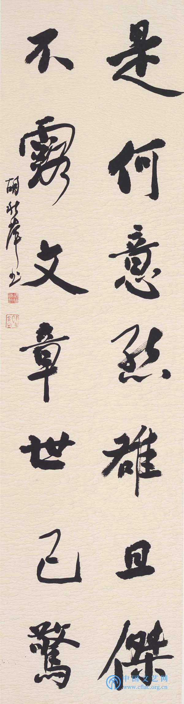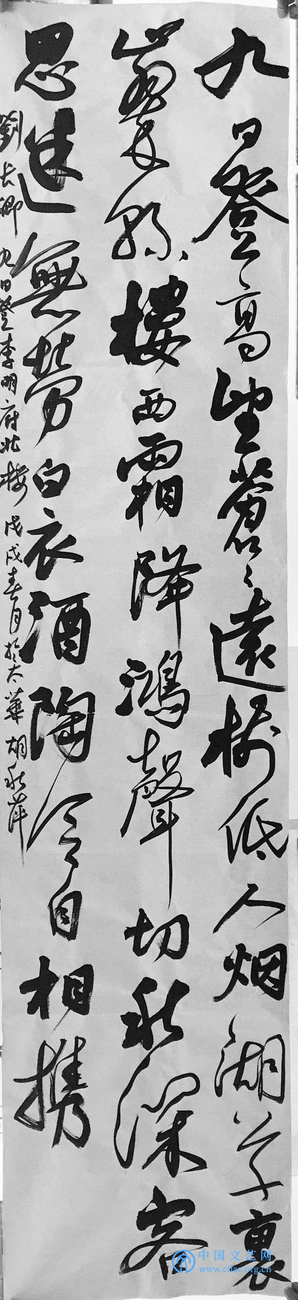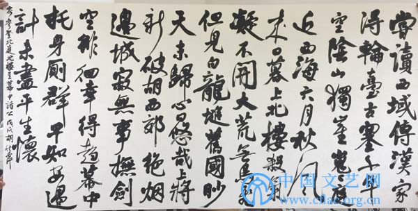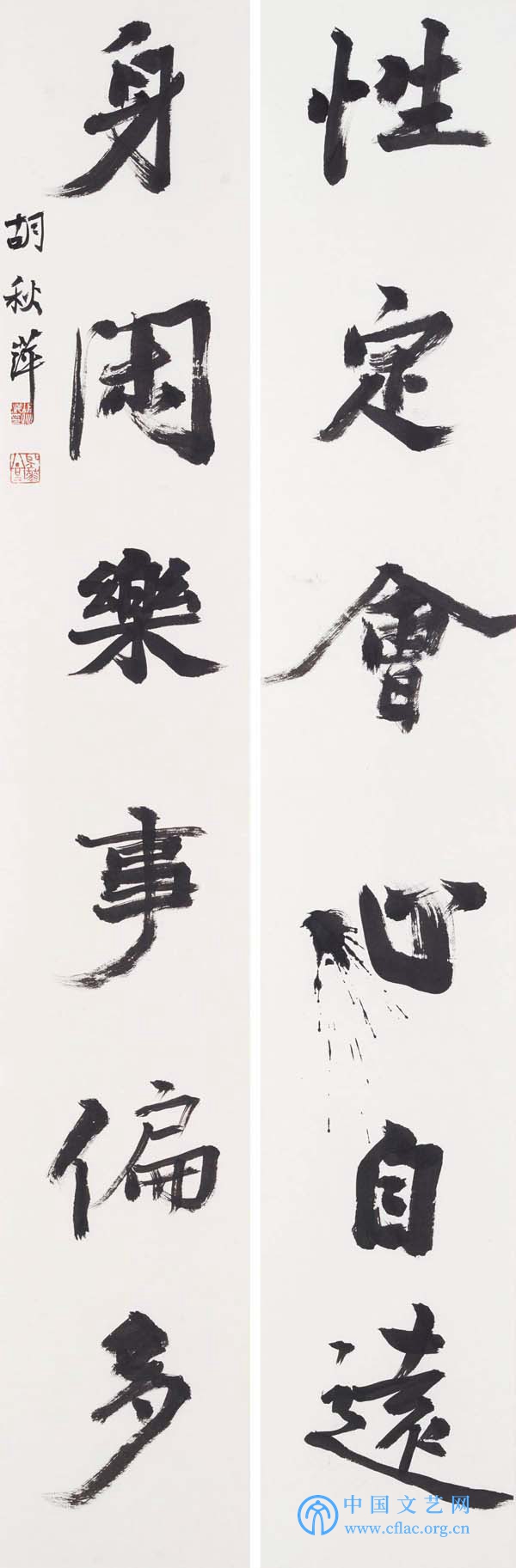 胡秋萍以一手大气超拔的行草书独树一帜。她的书法师出王铎的雄强,参以魏碑的质朴,吸收现代书法的构成,加之魏晋书法的细腻灵动,章法跌宕有致,纵横捭阖,墨色对比大胆,用笔方圆兼修,走出了一条特立独行的成功探索之路。她写散文,作诗词,能吟诵,兴趣广泛。这些都滋润了她书法的厚度与风采。她有胆识,有中原豪士的雄姿,也不乏女性的婉约。 她长于大幅草书,纵横恣肆之间流溢着洒脱,具有阳刚之气。她书法的感人之处,也来于她的情致、情愫、情思。陆游所谓“汝果欲学诗,功夫在诗外”,书法亦然。不学无文、生活无趣,必将有字匠之讥,哪里谈得上书法?文化的意义,大抵在此。她认为书法是书写智慧的艺术,她曾说: “以笔墨和汉字书写作为载体,实现了我对美与永恒的追求,也是我作为当代艺术工作者的个性化视角诠释和艺术表达。借由此,也是我对生命终极意义不断地探索、追求。”