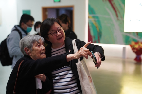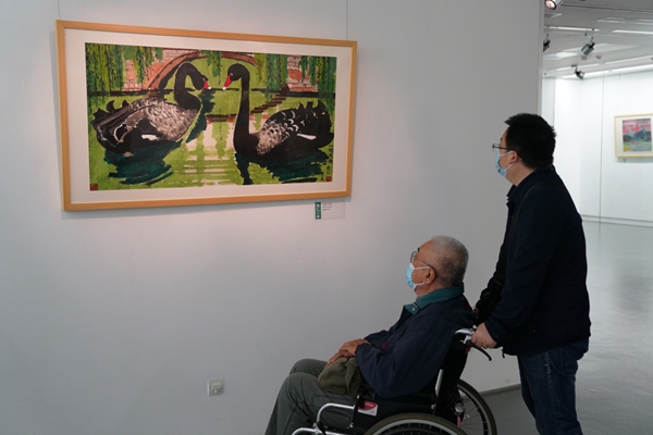 中国老舍研究会原会长、老舍研究专家关纪新坐在轮椅上细赏每幅画作