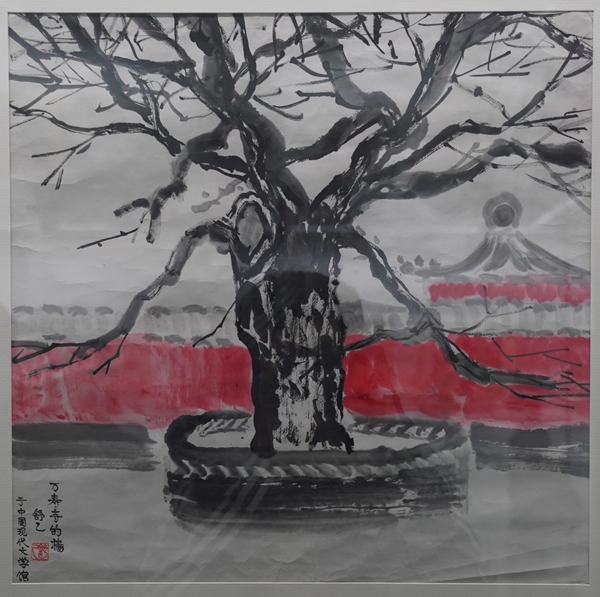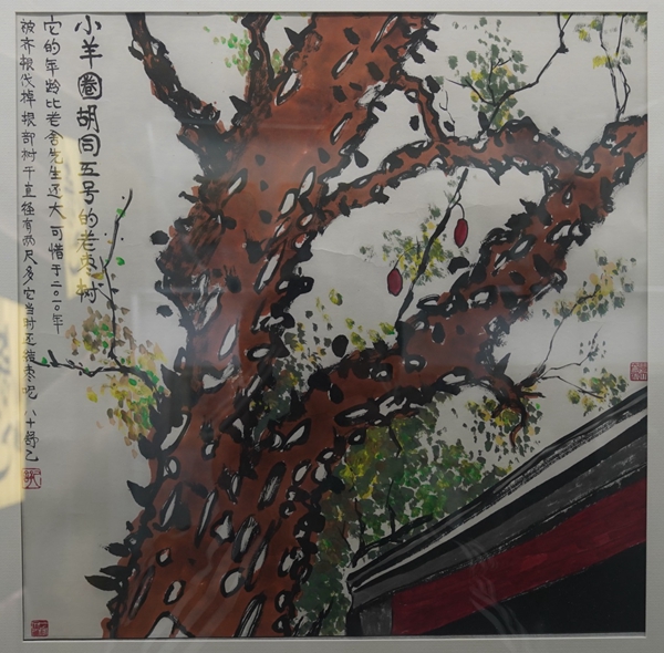 《小羊圈胡同五号的老枣树》,舒乙绘于2015年,82cm×82cm。这幅画作上,舒乙题记“它的年龄比老舍先生还大,可惜于二〇一〇年被齐根伐掉。根部树干直径有两尺多,它当时还结枣呢。八十舒乙”。