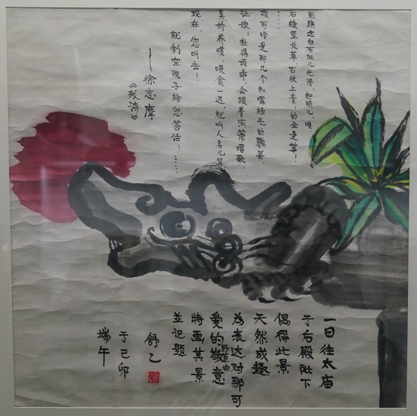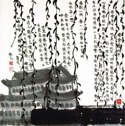 《老舍爱北京》,舒乙绘,82cm×82cm。这幅画的题记中,舒乙先生写下父亲老舍的北京情缘:“老舍先生说,他真爱北京,他所爱的北京不是枝枝节节的一些什么,而是整个儿与他的心灵粘合的一段历史,一大块地方,多少名胜风景,从雨后什刹海的蜻蜓一直到他梦里的玉泉山的塔影,都积凑到一块,每一小的事件中有他,而他的每一思念中有个北京,这只有像爱母亲那样要说而说不出而已。这里所画的是老舍先生最喜爱的积水潭,由这儿能看见德胜门门楼和古老的城墙,他可以在这安静地坐一整天。”