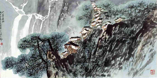 张登堂 《山寨春雨》68cm x 136cm