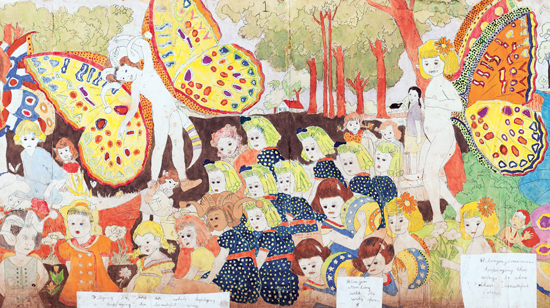 亨利·达格创作的24x109英寸双面全景作品,作品一面表现了画中的孩子们在杂耍滑稽演员的逗趣中快乐玩耍,另一面则展示了“扼杀孩子的男性形象”。(图片由柯蒂斯·卡特提供)