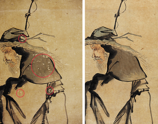黄慎的《苏武牧羊图》(局部)修复前后对比 红圈部位为修复前破损处