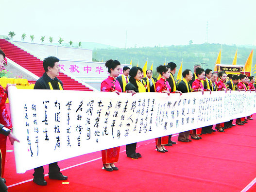 在黄帝陵笔会祭祖活动现场书法家展示21米的书法长卷