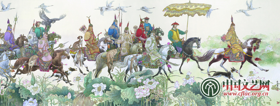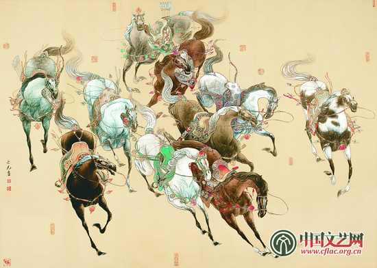 工笔鞍马画始创于唐,发展于宋,衰败于元。清宫之中虽然也有几位洋人画家画了不少鞍马画作品,遗憾的是洋人唱京剧——洋味太重。现代画家徐悲鸿,创作了大量的写意马作,开创了新的画马空间。但一千多年前开创的工笔鞍马绘画并未得到继承和发展,留下了六七百年的发展空间。新中国成立,特别是改革开放之后,中华大地政通民和,经济繁荣,百花齐放,百家争鸣,文化空前发展。盛世年华,再创大唐工笔鞍马画派的繁荣和发展,这是历史的必然,时代的需要,也使我产生了填补这一空间的冲动。选择了目标,看准了方向,就必须目空一切,一意孤行,走自己的路,攀心中的山。