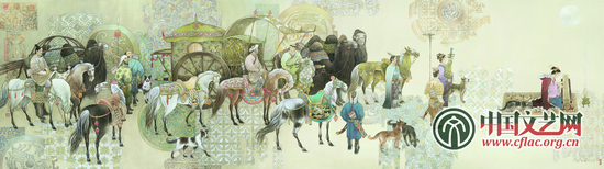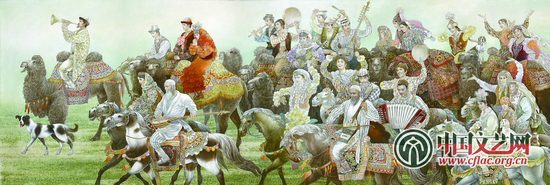 一路祝福一路歌 一对新疆少数民族青年结婚了,热闹而欢乐,既体现边疆牧民的幸福生活,也反映新疆各族人民的融洽和团结。我在孩子结婚时,创作了这幅作品,通过这幅作品送给我的孩子和全国各族人民的孩子,并祝天下所有的孩子幸福快乐,万事如意。