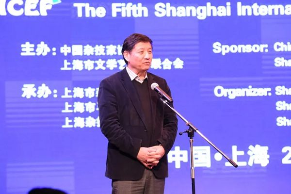图为全国政协常委、中国文联副主席、中国杂协主席边发吉讲话
