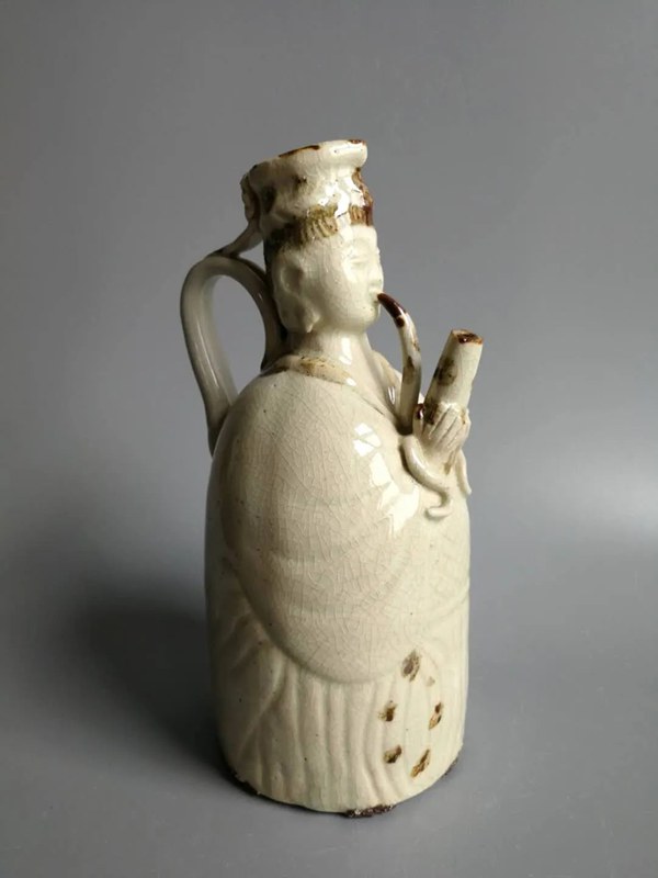 这是“女仙吹笙”的造型,壶口开于人头发髻顶端,口沿饰羽冠,脑后至肩部以两根飘带并列为壶把;直流塑成笙状,笙与人嘴之间由一细管相连接,双手捧笙以固流,溜肩,人身以刻划纹勾勒成袍服为壶腹,直筒型,平底。人物面目清秀,形态生动。白釉呈赭白色,布满小块开片,淡雅光润,施满釉。并以棕褐色彩饰发、襟和笙管等部位。总之,人物造型刻画生动、栩栩如生。
