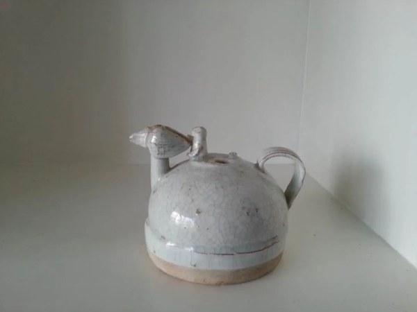 人物状的执壶比较稀少,除此之外,这件执壶的特殊之处在于其棕褐色的点彩,在执壶类里是一件难得的典型器皿。此执壶在传统白釉的基础上加了点彩,从制作工艺方面来说增加了一道工序,所以也增加了其美感。流传至今,保存完好。