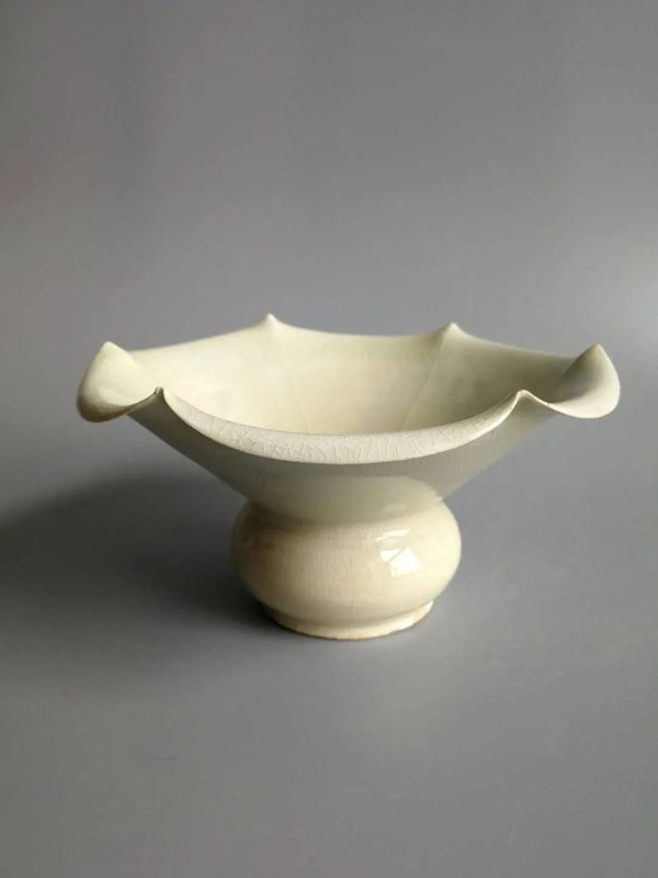 在灿若繁星的宋代各大名窑中,景德镇青白瓷以其光致茂美、如冰似玉的釉色名满天下,而其中以湖田窑烧造的青白瓷最为精美,冠绝群窑。这件青白釉花口唾盂,是皇家贵族漱口用的器皿,俗称“渣斗”。其形状优美,宛如花朵,制作精良,极富圆润和韵律之美。从花瓣口至收口处,刻划出六条瓜棱竖线条纹,线条丰满圆润,富有韵律感。白胎白釉,清净柔和,温润似玉。