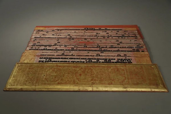 展厅中的一套嵌琉璃经板的宋代巴利文贝叶经,则展示了这一佛教圣物的另一形态。贴金的叶片上有华丽的装饰纹路,但经文并非铁笔刻划,而是以暗红色的漆描写而成。据介绍,这并非普通的墨迹,而是高僧大德刺破舌头后,以鲜血混合珍珠、玛瑙、朱砂等,调和后书写的经文。