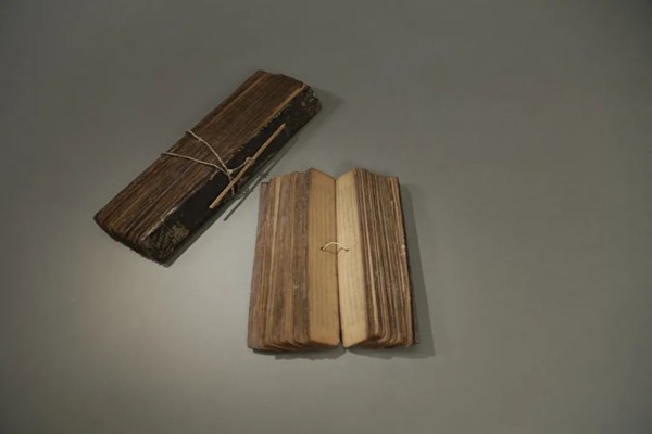 这也是贝叶经制作工艺的好处所在。叶片被砍下后,一片片修割整齐,放入锅中与酸角或柠檬同煮,直至表皮脱落呈淡绿白色;又要以细沙搓洗,压平晒干,此后才能两边钻孔,装订成匣。至于刻写,则是用尖锐的铁簪子在叶片双面都刻上经文,再涂上植物果油与碳粉的混合物,清理干净后,黑色的字迹方清晰显现。