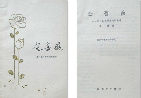 几年后,上个世纪八十年代初期,我又读到了康·帕乌斯托夫斯基的《金蔷薇》。翻译者是李时,上海译文出版社一九八〇年九月新一版。白色的封面上,左侧三分之一的位置,是一高一低两枝花和各自的几片叶子,线条简约,颇有几分绢花意味。封底右下角书号和定价的上面,印着“内部发行”。