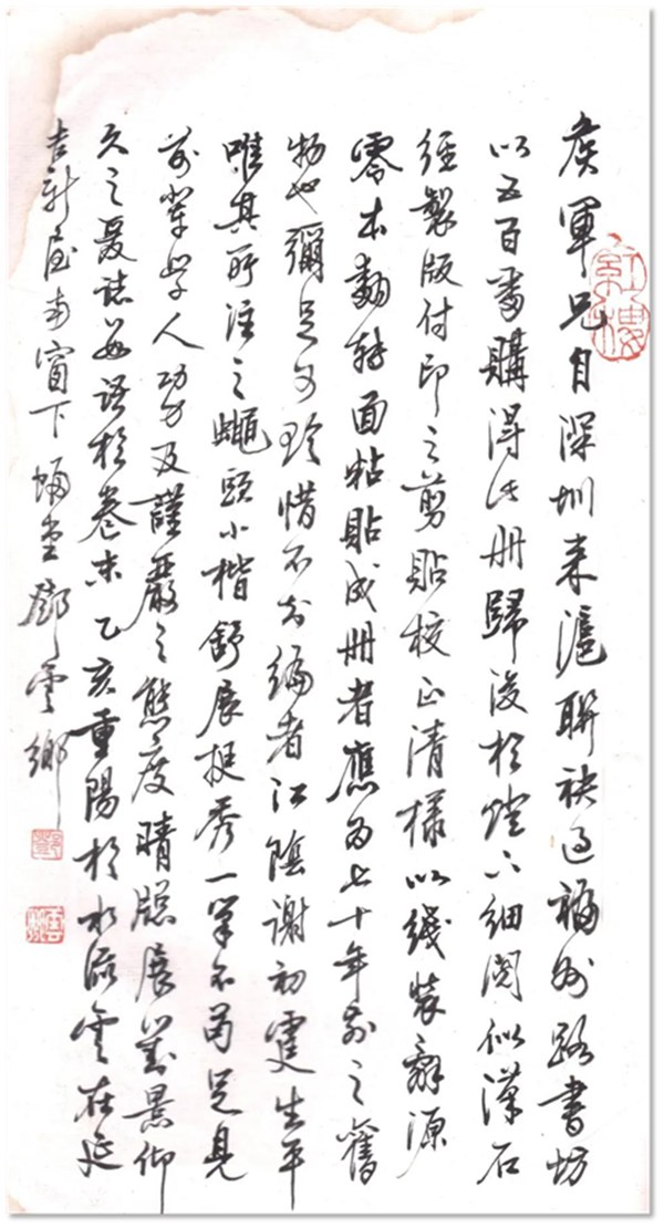 第二天一大早,邓公就起床了。他把我叫到自己的房间里,指着摊在桌面上的那册书稿,说他昨夜细读了一下,觉得这位作者很不简单,不光字写得漂亮,学问也做得扎实,对汉代熹平石经残石很有研究,对残石上残存的每一个字,都逐字逐句做出了精审的校订和考证。“你瞧,我刚才已经把我的‘读书心得’给你写在卷尾了,供你回去读书时参考。”我连忙俯过身去观看,只见在书稿的最后一页,邓公以那特有的清秀潇洒的小楷行书,为我题写了这样一段跋语:“侯军兄自深圳来沪,联袂过福州路书坊,以五百番购得此册。归后于灯下细阅,似汉石经制版付印之剪贴校正清样,以线装《辞源》零本翻转面粘贴成册者,应为七十年前之旧物也,弥足可珍。惜不知编者江阴谢初霆生平,唯其所注之蝇头小楷舒展挺秀,一笔不苟,足见前辈学人功力及严谨之态度。晴窗展对,景仰久之。爰志数语于卷末。乙亥重阳于水流云在延吉新屋南窗下。蝠堂邓云乡。”下钦两枚小小私印,跋前也盖上一枚迎首印,为邓公常用的“红楼”二字。