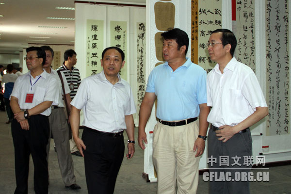 8月24日至26日,“庆祝建党90周年全国产业(行业)系统书法美术摄影精品展”在京举办。图为中国文联党组副书记、副主席覃志刚,中国文联党组成员、书记处书记夏潮,中国文联国内联络部主任罗成琰等参观展览。中国文联网 云菲 摄