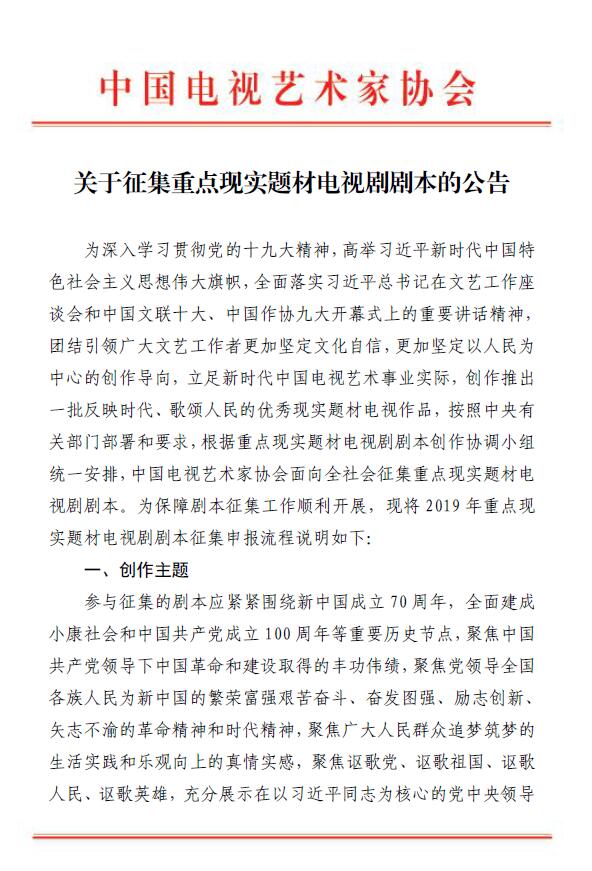 中国视协关于征集重点现实题材电视剧剧本的公告