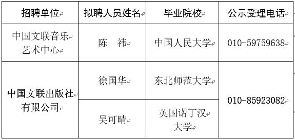 根据《中国文联所属单位2019年公开招聘工作人员公告》精神,经过资格审查、笔试、面试、体检、考察等环节,拟聘用陈祎等3名同志为相关单位工作人员,现予以公示。公示期间,如有问题,请向有关单位反映或举报。