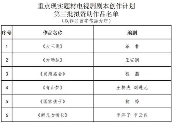 自重点现实题材电视剧剧本征集工作开展以来,社会各界踊跃参与。经重点现实题材电视剧剧本审阅专家严格审看,2019年度部分征集剧本的审阅工作现已完成,第三批拟对以下6部剧本进行资助(拟资助作品名单附后)。现面向全国进行公示,接受社会监督。征求各界群众意见,有关事项通告如下: