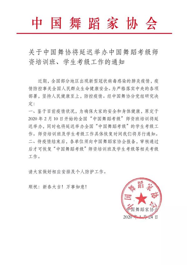 关于中国舞协将延迟举办中国舞蹈考级师资培训班、学生考级工作的通知