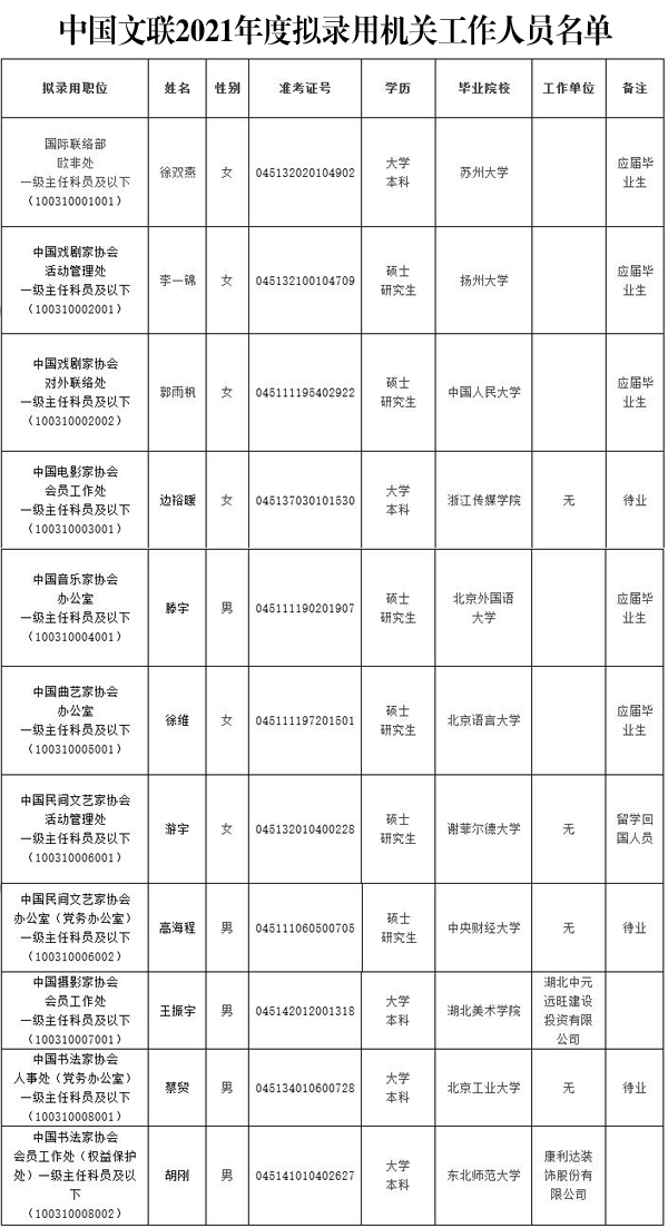 根据2021年度中央机关及其直属机构考试录用工作有关要求,经过笔试、面试、体检和考察等程序,确定徐双燕等11名同志为中国文联2021年度拟录用工作人员(名单附后),现将有关情况予以公示,公示期为5个工作日。公示期间如有问题,请向中国文联人事部反映。