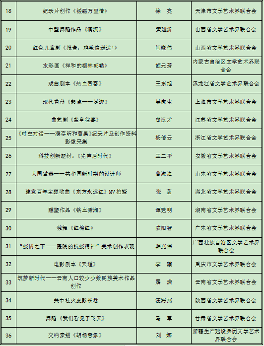 中国文联2021年度青年文艺创作扶持计划资助项目一览表
