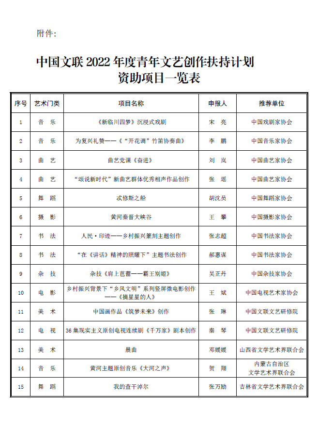 附件:中国文联2022 年度青年文艺创作扶持计划资助项目一览表