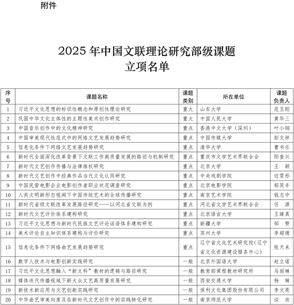 《2025年中国文联理论研究部级课题申报指南》于2025年2月25日在《中国艺术报》、中国文艺网正式发布,得到了中国文联各团体会员、全国各高等院校、相关研究机构及组织的积极响应和大力支持。经严格评审,共有20个课题组入选2025年中国文联理论研究部级课题(具体课题名称、类别、单位及负责人详见附件)。