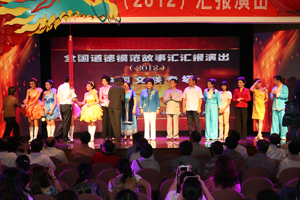 7月30日,由中央文明办、中国文联主办,中国曲协、中国文联机关党委承办的2012年“全国道德模范故事汇”中国文联专场演出中,一个个全国道德模范的先进事迹和感人故事,通过刘兰芳、田连元、牛群、佟长江、闫淑平、史琳、刘朝、宋丹红等艺术家们的倾情演绎,令现场数百名中国文联干部职工深受感动。