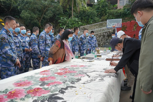 活动现场,海南省美协文艺服务志愿者们激情四溢、翰墨挥洒、丹青斗彩,妙笔生花,为部队官兵现场创作并送书画作品100余幅。“繁花竟放新时代”、“和谐”、“雅韵”……一幅幅意韵深远、格调高雅的大画作铺展眼前。