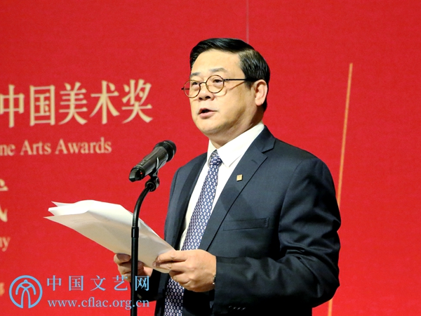 12月20日,第十三届全国美展进京作品展开幕式暨第三届中国美术奖颁奖仪式在京举行,图为文化和旅游部党组成员王晓峰在开幕式上致辞。中国文艺网 韩雪竹摄