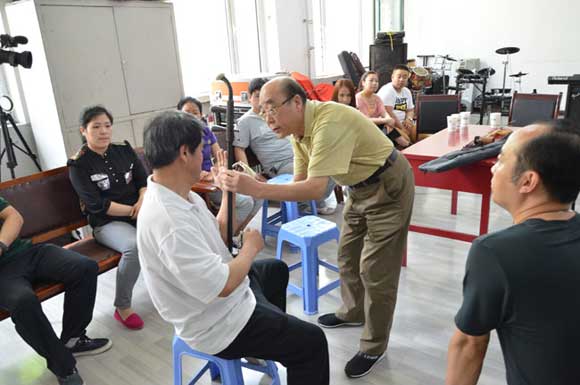 中国煤矿音乐家协会副主席张永智向器乐爱好者传授二胡和雷琴技法