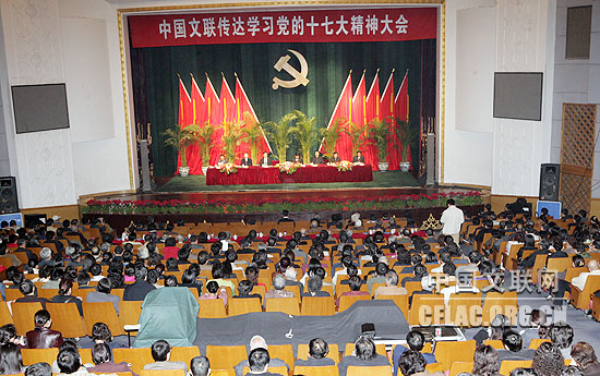10月24日,中国文联在京召开大会传达学习党的十七大精神。中国文联党组书记、副主席胡振民,党组副书记、副主席覃志刚、李牧,党组成员、副主席冯远、杨志今,党组成员、主席团委员廖奔、白庚胜出席了会议。中国文联在京主席团成员,中国文联所属各协会负责人、各直属单位和机关部室负责人,中国文联系统广大党员参加会议。会议由李牧主持。