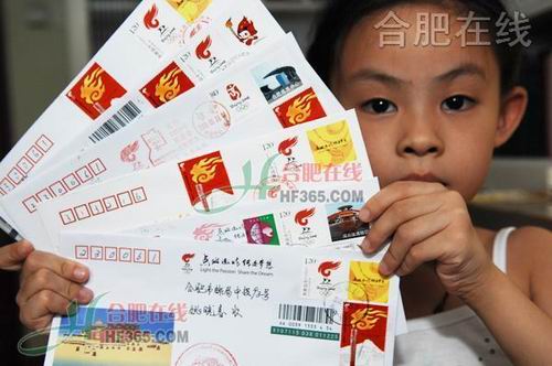 1日,合肥市民姚晓春收到一封从西宁寄来的挂号信。信封很特别,是中国集邮总公司为各传递城市发行的纪念封,上面有三张邮票两个章,邮票是火炬传递邮票和当地邮票,加上圣火传递当天的纪念戳和邮政日戳。目前姚晓春已经收到100多个奥运纪念封。姚晓春说,他要用特别的方式来迎接奥运。