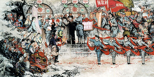 中国画作品《八路军秧歌队进村来》